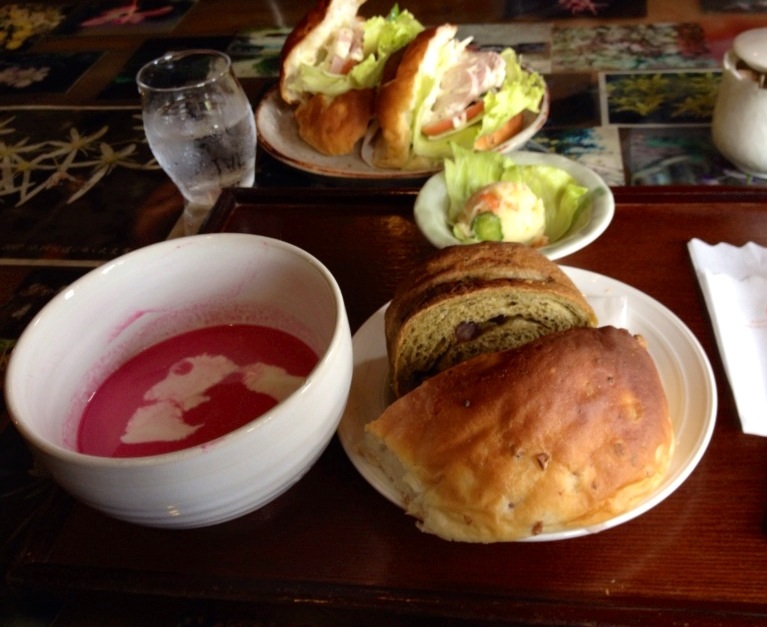 焼きたてパンと鮮やかなピンクのビーツのスープ!