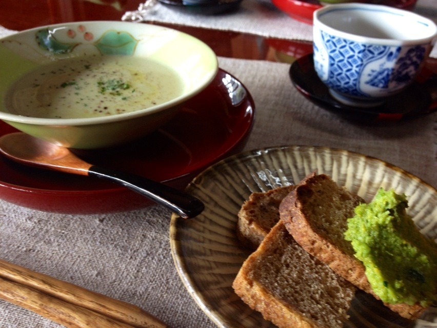 カリフラワーのポタージュと天然酵母の自家製ライ麦パン、ブロッコリーペースト添え。