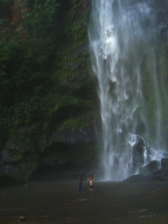 1つ目の滝。ここまではなだらかな林道を歩き、簡単にたどり着ける。落差が大きいため、途中で霧となり消えてしまう水が多いからか、これほどの規模の滝の割に滝壺が案外浅い。でも近づくと、やはりダイナミックで、滝から吹く風が心地よかった^^