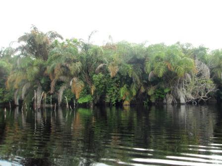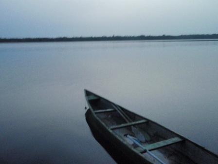 ようやくボートが漕げるほどの水かさがあるところまでたどり着き、そこからボートで約30分。ジャングルの中の細い水路を抜けて、大きな湖に出る。