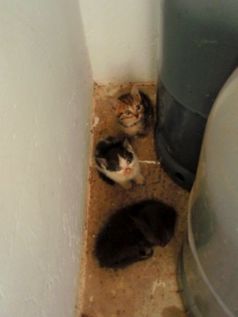ある朝、キッチンに行ったら、3匹がガスボンベの裏で縮こまっていた。かわいい(><)