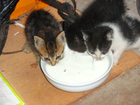 パンとミルクでつってみる。つられて、パンを食べに来るにゃんこ♪ 可愛い…