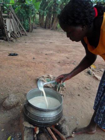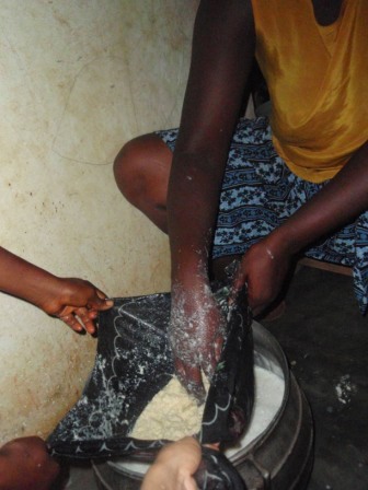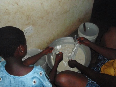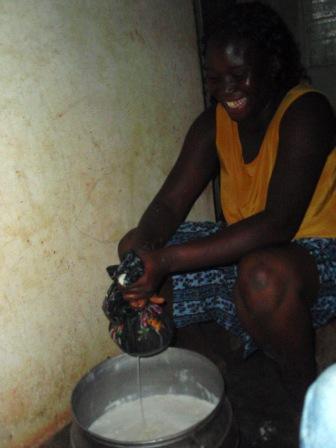 すると、横でママのVeronicaと姪のSandraが豆乳アイス作りを始めた。豆乳、小さい頃はあんまり美味しくないのに、体に良いからと親に無理やり飲まされてた気がするけど、大人になってから結構好きになった。ガーナでも豆乳は買える。でも、とても甘い。最初はおいしいのだけど、やっぱり甘すぎる。ホストファミリーが作るものは、ホントにローカルなもので、彼らはこれを凍らせて、アイス?シャーベットにして売る。ママは小学校の先生なので、学校で子ども達に売っているらしい。日本じゃ、先生が生徒相手に商売するなんて考えられないけど、ここじゃ普通。