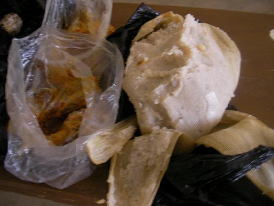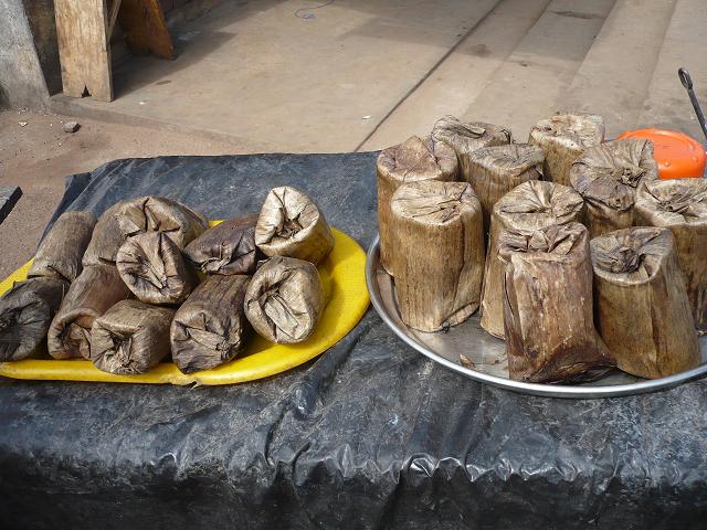 トウモロコシの粉から作られていて、見た目はご覧のとおり、ダンゴか??というような感じ。トウモロコシの皮や笹の葉にくるまれて、路上で売っている。1個20円くらい。
