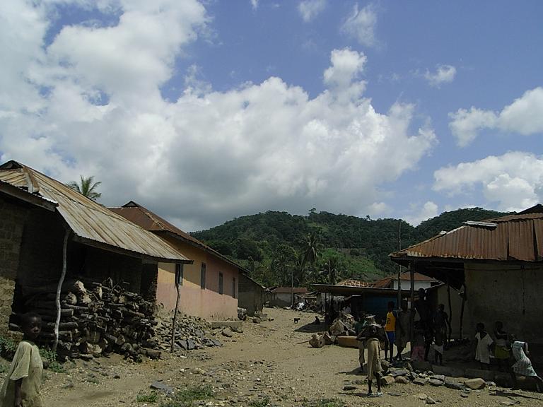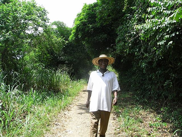 村までの道はさらに険しく道が細いため、車では行けず、手前の村に車を起き、そこからは徒歩。ガーナ人の「1Kmくらいだよ」は、最初っから信じちゃいないけど、やっぱりなかなか遠かった・・しかも山道。写真撮影で、キツさを紛らわしながらも、途中から湖が見えてくると、やっぱりテンション上った。