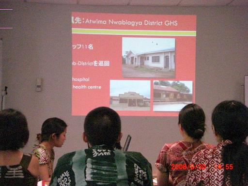 任地紹介から始まり、この1年でやってきたこと、今やっている活動と今後の課題、方向性、JICAへの提言などを報告する。1人10分と短いので、そんなに細かくは説明できないが、同期10人、それぞれが発表し、みんながどんな1年を過ごしてきたのか、どういう活動をやっているのかを知ることができて、自分とはまた違った視点からのガーナを垣間見れて新鮮だった。