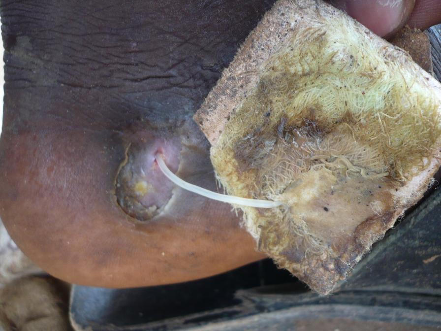 ギニアウォームの治療では抗生剤を内服するが、虫が体から去るのを待つしかない。しかも虫は一匹とは限らない。私が訪問した患者さんは、まさに今虫が出てきているところで、これも無理に引き出すのではなく、少しずつ出していくしかないそう。
