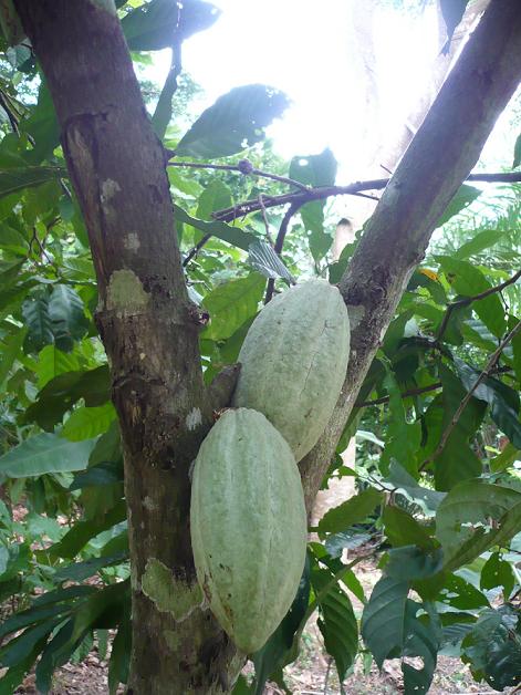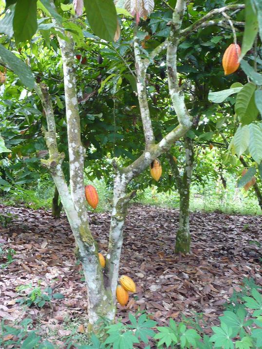 そこらじゅうにカカオ畑?いや、カカオの森がある。なんだか奇妙な実り方をしているけど、色づいたカカオはとってもキレイ。