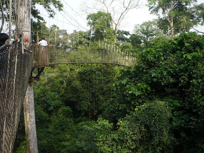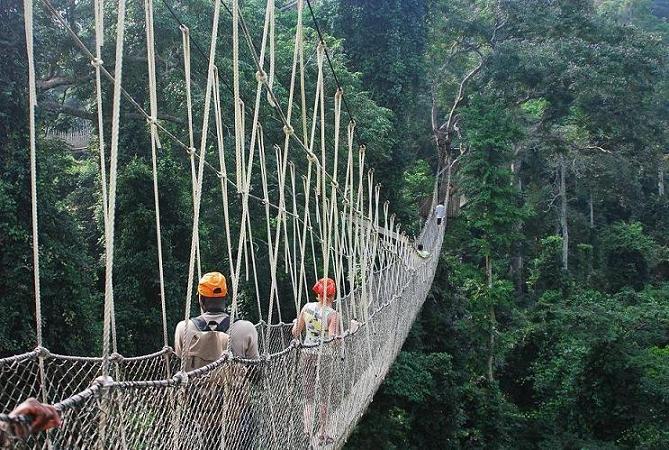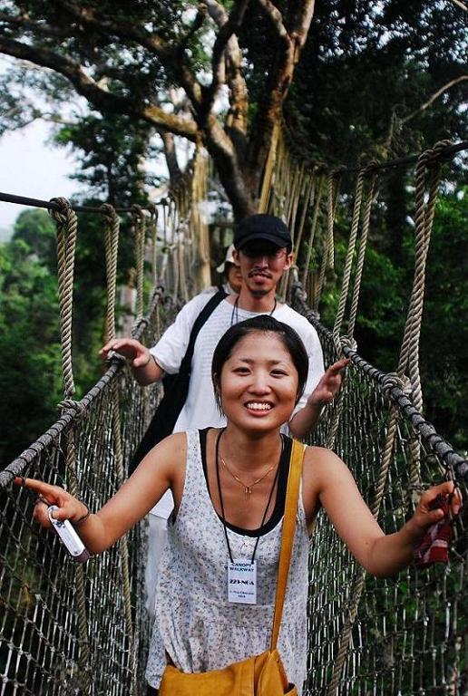 木にくくりつけてある吊り橋は人が一人通れるくらいの細さで、一番高いところで地上40mらしい。