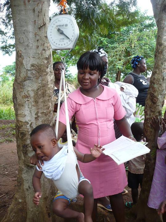 Twi語が話せないので問診はできないし、ガーナの看護師免許を持っていないため注射もできないので、私にできることと言えば体重測定。木にぶら下げた体重計で、赤ちゃんを布の袋にいれて、体重を計る。時々袋の縫い目が破れて、赤ちゃんが落っこちそうになるというちょっと危険な体重測定器。