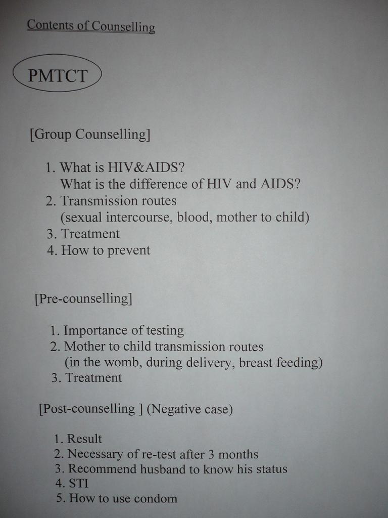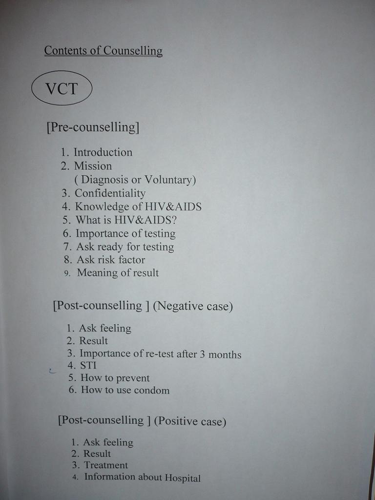 郡病院には3人のカウンセラーがいる。彼女たちは全員助産師なので、そちらの仕事もしながら、カウンセラーの仕事もしなければならない。忙しいために、どうしてもVCTは後回しになってしまっている。しかし、その現状をどうにかするために、私が派遣された訳であって、どうにかしていかなければいけない。ということで、まずはカウンセリングの内容を見直し、項目を決定した↓