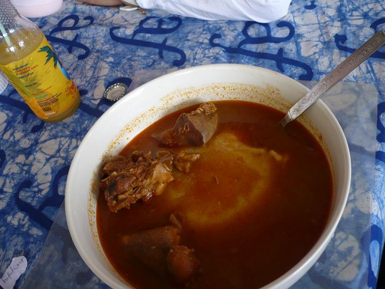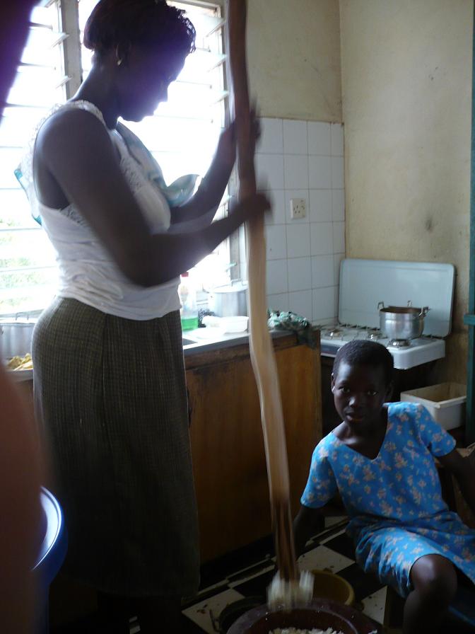キャッサバ、プランテーン、ヤムイモなどの粉をすり潰して、練って、お餅のようにしたもの。それをシチューと呼ばれるスープに入れて食べる。フフ自体はおいしい☆と私は思う。しかし、このスープは激辛デシタ…