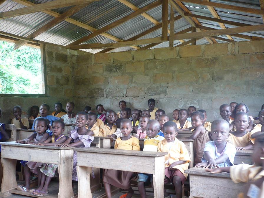 ホームステイ中、1日だけVeronicaの働いている小学校へ連れていってもらった。Nkawieの隣の郡の村にある小学校だった。窓やドアはないが、青空教室ではなく、屋根と壁はある教室だった。